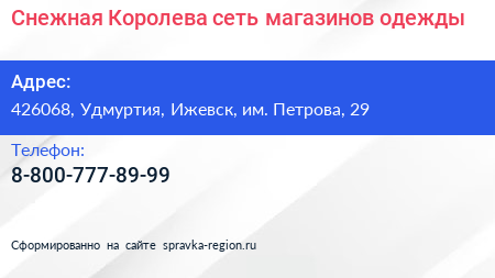 Снежная Королева, сеть магазинов одежды по адресу 426068, Удмуртия, Ижевск, им. Петрова, 29 в дальнейшем Организация, размещена в следующих категориях: