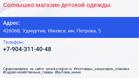Солнышко, магазин детской одежды по адресу 426068, Удмуртия, Ижевск, им. Петрова, 5 в дальнейшем Организация, размещена в следующих категориях: