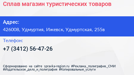 Сплав, магазин туристических товаров по адресу 426008, Удмуртия, Ижевск, Удмуртская, 255в в дальнейшем Организация, размещена в следующих категориях:
