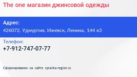 The one, магазин джинсовой одежды по адресу 426072, Удмуртия, Ижевск, Ленина, 144 к3 в дальнейшем Организация, размещена в следующих категориях: