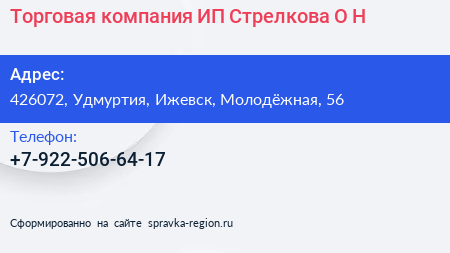 Торговая компания, ИП Стрелкова О.Н. по адресу 426072, Удмуртия, Ижевск, Молодёжная, 56 в дальнейшем Организация, размещена в следующих категориях: