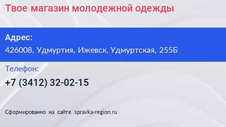 Твое, магазин молодежной одежды по адресу 426008, Удмуртия, Ижевск, Удмуртская, 255Б в дальнейшем Организация, размещена в следующих категориях: