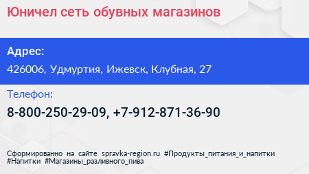 Юничел, сеть обувных магазинов по адресу 426006, Удмуртия, Ижевск, Клубная, 27 в дальнейшем Организация, размещена в следующих категориях: