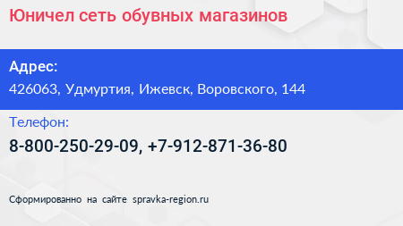 Юничел, сеть обувных магазинов по адресу 426063, Удмуртия, Ижевск, Воровского, 144 в дальнейшем Организация, размещена в следующих категориях: