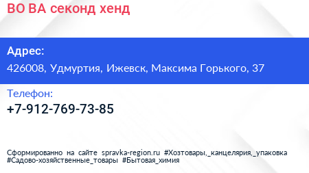 ВО!ВА!, секонд-хенд по адресу 426008, Удмуртия, Ижевск, Максима Горького, 37 в дальнейшем Организация, размещена в следующих категориях: