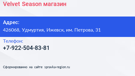 Velvet Season, магазин по адресу 426068, Удмуртия, Ижевск, им. Петрова, 31 в дальнейшем Организация, размещена в следующих категориях: