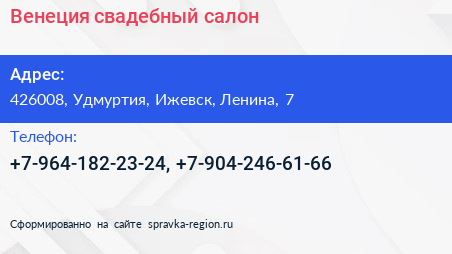 Венеция, свадебный салон по адресу 426008, Удмуртия, Ижевск, Ленина, 7 в дальнейшем Организация, размещена в следующих категориях: