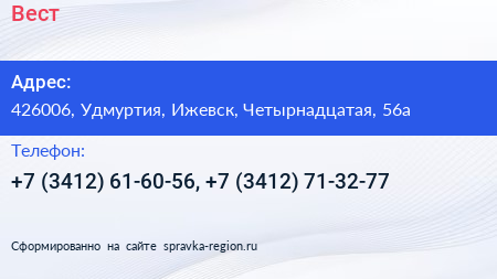 Вест по адресу 426006, Удмуртия, Ижевск, Четырнадцатая, 56а в дальнейшем Организация, размещена в следующих категориях: