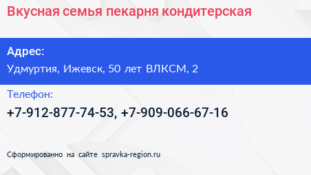Вкусная семья, пекарня-кондитерская по адресу Удмуртия, Ижевск, 50 лет ВЛКСМ, 2 в дальнейшем Организация, размещена в следующих категориях: