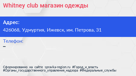 Whitney club, магазин одежды по адресу 426068, Удмуртия, Ижевск, им. Петрова, 31 в дальнейшем Организация, размещена в следующих категориях:
