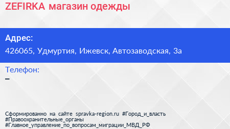 ZEFIRKA, магазин одежды по адресу 426065, Удмуртия, Ижевск, Автозаводская, 3а в дальнейшем Организация, размещена в следующих категориях: