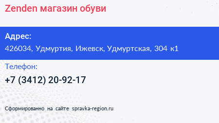 Zenden, магазин обуви по адресу 426034, Удмуртия, Ижевск, Удмуртская, 304 к1 в дальнейшем Организация, размещена в следующих категориях: