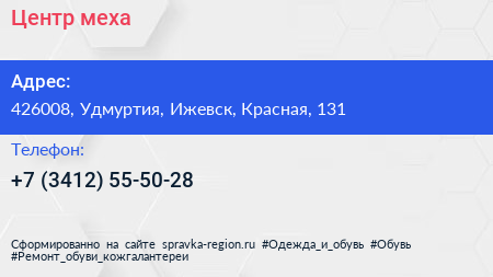Центр меха по адресу 426008, Удмуртия, Ижевск, Красная, 131 в дальнейшем Организация, размещена в следующих категориях: