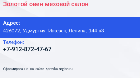 Золотой овен, меховой салон по адресу 426072, Удмуртия, Ижевск, Ленина, 144 к3 в дальнейшем Организация, размещена в следующих категориях: