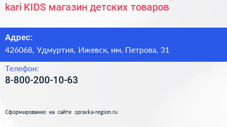 kari KIDS, магазин детских товаров по адресу 426068, Удмуртия, Ижевск, им. Петрова, 31 в дальнейшем Организация, размещена в следующих категориях: