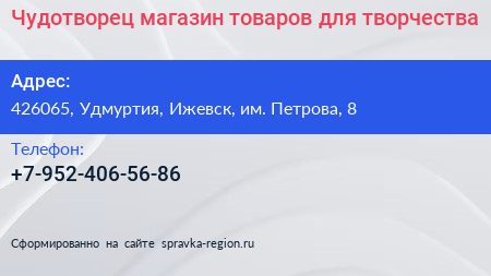 Чудотворец, магазин товаров для творчества по адресу 426065, Удмуртия, Ижевск, им. Петрова, 8 в дальнейшем Организация, размещена в следующих категориях: