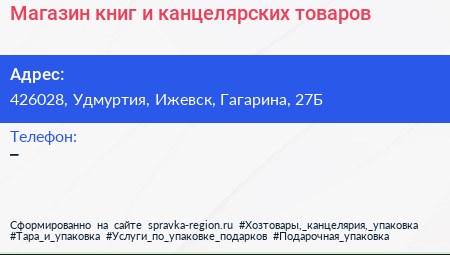 Магазин книг и канцелярских товаров по адресу 426028, Удмуртия, Ижевск, Гагарина, 27Б в дальнейшем Организация, размещена в следующих категориях: