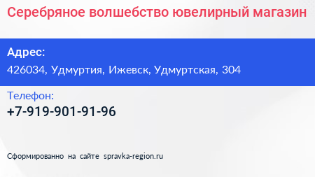 Серебряное волшебство, ювелирный магазин по адресу 426034, Удмуртия, Ижевск, Удмуртская, 304 в дальнейшем Организация, размещена в следующих категориях: