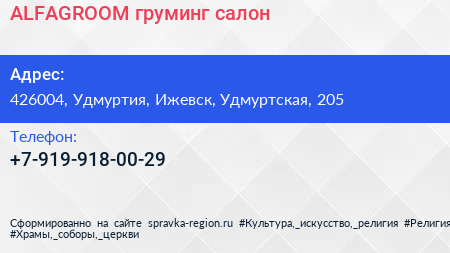 ALFAGROOM, груминг-салон по адресу 426004, Удмуртия, Ижевск, Удмуртская, 205 в дальнейшем Организация, размещена в следующих категориях: