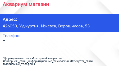 Аквариум, магазин по адресу 426053, Удмуртия, Ижевск, Ворошилова, 53 в дальнейшем Организация, размещена в следующих категориях: