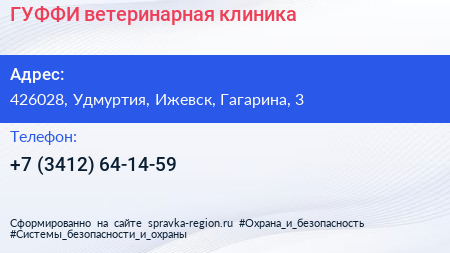 ГУФФИ, ветеринарная клиника по адресу 426028, Удмуртия, Ижевск, Гагарина, 3 в дальнейшем Организация, размещена в следующих категориях:
