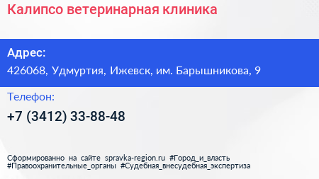 Калипсо, ветеринарная клиника по адресу 426068, Удмуртия, Ижевск, им. Барышникова, 9 в дальнейшем Организация, размещена в следующих категориях: