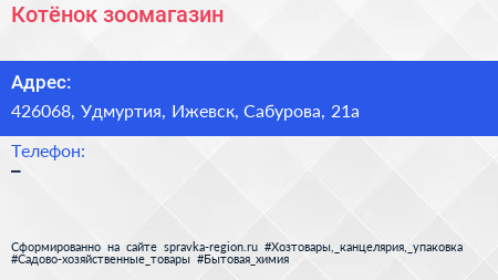 Котёнок, зоомагазин по адресу 426068, Удмуртия, Ижевск, Сабурова, 21а в дальнейшем Организация, размещена в следующих категориях: