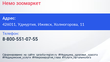 Немо, зоомаркет по адресу 426011, Удмуртия, Ижевск, Холмогорова, 11 в дальнейшем Организация, размещена в следующих категориях:
