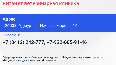 ВитаВет, ветеринарная клиника по адресу 426033, Удмуртия, Ижевск, Кирова, 14 в дальнейшем Организация, размещена в следующих категориях: