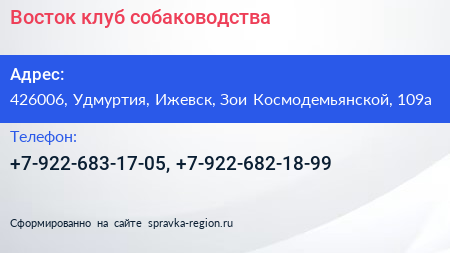 Восток, клуб собаководства по адресу 426006, Удмуртия, Ижевск, Зои Космодемьянской, 109а в дальнейшем Организация, размещена в следующих категориях: