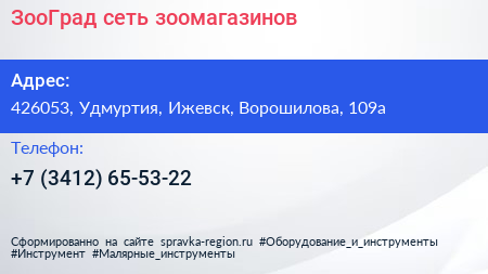 ЗооГрад, сеть зоомагазинов по адресу 426053, Удмуртия, Ижевск, Ворошилова, 109а в дальнейшем Организация, размещена в следующих категориях: