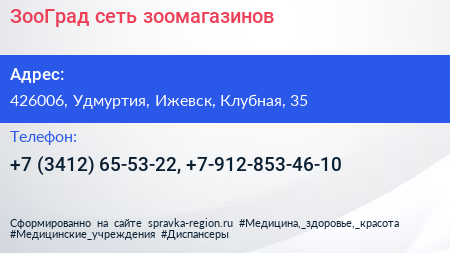 ЗооГрад, сеть зоомагазинов по адресу 426006, Удмуртия, Ижевск, Клубная, 35 в дальнейшем Организация, размещена в следующих категориях: