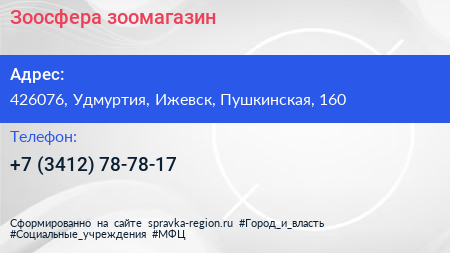 Зоосфера, зоомагазин по адресу 426076, Удмуртия, Ижевск, Пушкинская, 160 в дальнейшем Организация, размещена в следующих категориях: