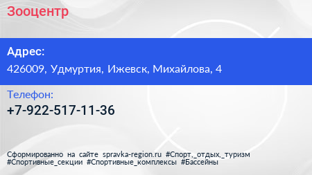 Зооцентр по адресу 426009, Удмуртия, Ижевск, Михайлова, 4 в дальнейшем Организация, размещена в следующих категориях: