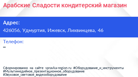 Арабские Сладости, кондитерский магазин по адресу 426056, Удмуртия, Ижевск, Лихвинцева, 46 в дальнейшем Организация, размещена в следующих категориях: