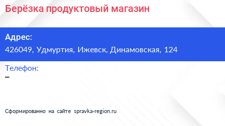 Берёзка, продуктовый магазин по адресу 426049, Удмуртия, Ижевск, Динамовская, 124 в дальнейшем Организация, размещена в следующих категориях: