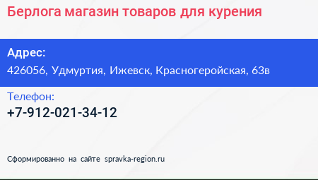 Берлога, магазин товаров для курения по адресу 426056, Удмуртия, Ижевск, Красногеройская, 63в в дальнейшем Организация, размещена в следующих категориях: