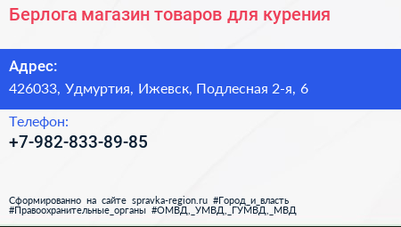 Берлога, магазин товаров для курения по адресу 426033, Удмуртия, Ижевск, Подлесная 2-я, 6 в дальнейшем Организация, размещена в следующих категориях:
