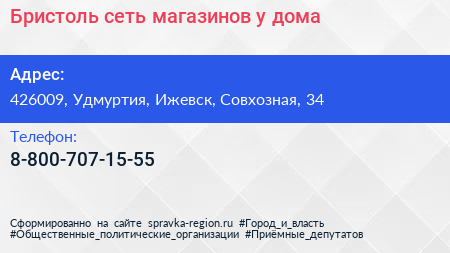 Бристоль, сеть магазинов у дома по адресу 426009, Удмуртия, Ижевск, Совхозная, 34 в дальнейшем Организация, размещена в следующих категориях:
