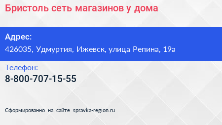 Бристоль, сеть магазинов у дома по адресу 426035, Удмуртия, Ижевск, улица Репина, 19а в дальнейшем Организация, размещена в следующих категориях: