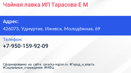 Чайная лавка, ИП Тарасова Е.М. по адресу 426073, Удмуртия, Ижевск, Молодёжная, 69 в дальнейшем Организация, размещена в следующих категориях: