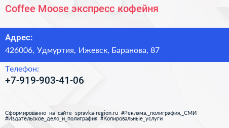 Coffee Moose, экспресс-кофейня по адресу 426006, Удмуртия, Ижевск, Баранова, 87 в дальнейшем Организация, размещена в следующих категориях: