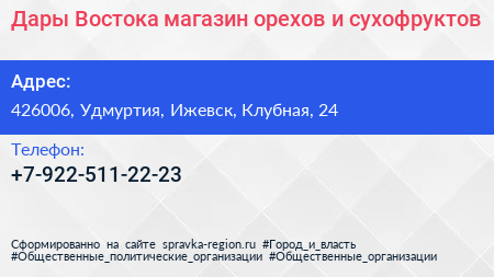 Дары Востока, магазин орехов и сухофруктов по адресу 426006, Удмуртия, Ижевск, Клубная, 24 в дальнейшем Организация, размещена в следующих категориях: