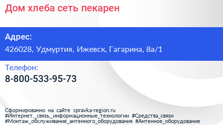 Дом хлеба, сеть пекарен по адресу 426028, Удмуртия, Ижевск, Гагарина, 8а/1 в дальнейшем Организация, размещена в следующих категориях: