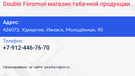 Double Feromon, магазин табачной продукции по адресу 426072, Удмуртия, Ижевск, Молодёжная, 90 в дальнейшем Организация, размещена в следующих категориях: