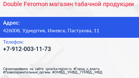 Double Feromon, магазин табачной продукции по адресу 426008, Удмуртия, Ижевск, Пастухова, 11 в дальнейшем Организация, размещена в следующих категориях: