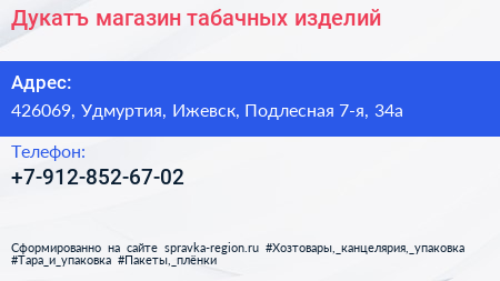 Дукатъ, магазин табачных изделий по адресу 426069, Удмуртия, Ижевск, Подлесная 7-я, 34а в дальнейшем Организация, размещена в следующих категориях: