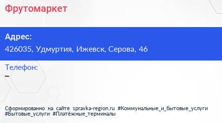 Фрутомаркет по адресу 426035, Удмуртия, Ижевск, Серова, 46 в дальнейшем Организация, размещена в следующих категориях: