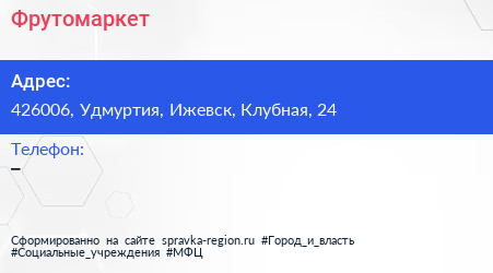 Фрутомаркет по адресу 426006, Удмуртия, Ижевск, Клубная, 24 в дальнейшем Организация, размещена в следующих категориях: