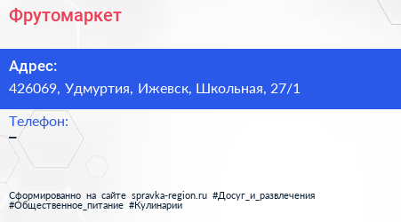 Фрутомаркет по адресу 426069, Удмуртия, Ижевск, Школьная, 27/1 в дальнейшем Организация, размещена в следующих категориях: